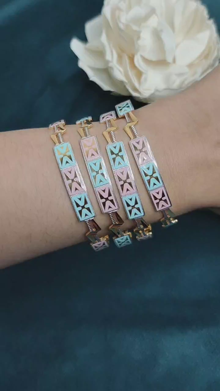 These 1 gram gold meenakari delicate unique cross design bangles feature a beautifully intricate cross motif, enhanced with vibrant enamel detailing and a rich gold-plated finish. The unique design offers a modern twist on classic elegance, making them perfect for adding a sophisticated touch to any festive or traditional occasion.