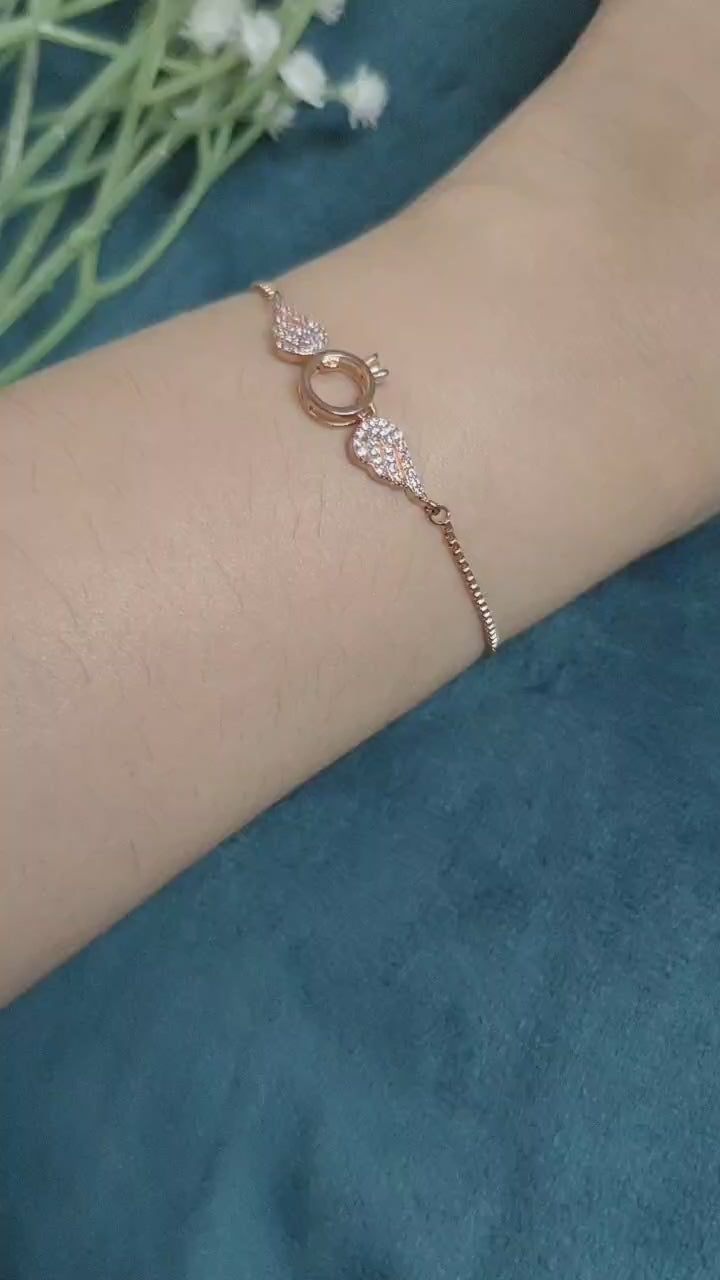 This celestial-inspired bracelet is a delicate and meaningful piece crafted from 92.5 sterling silver. The design features angel wings adorned with sparkling cubic zircon that add a touch of glamour and ethereal beauty. The rose gold plating lends a warm, blush hue, creating a sophisticated and feminine look.