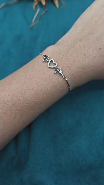 Capture the pulse of modern elegance with this 92.5 sterling silver adjustable bracelet, boasting a striking heartbeat lifeline design. At its core, a dainty heart charm is encrusted with sparkling cubic zircon stones, accompanied by polished zig-zag accents that represent life and passion. The special chain features a combination of modern bar links and a classic fine chain, completed with an extender chain to provide a loose and comfortable fit.