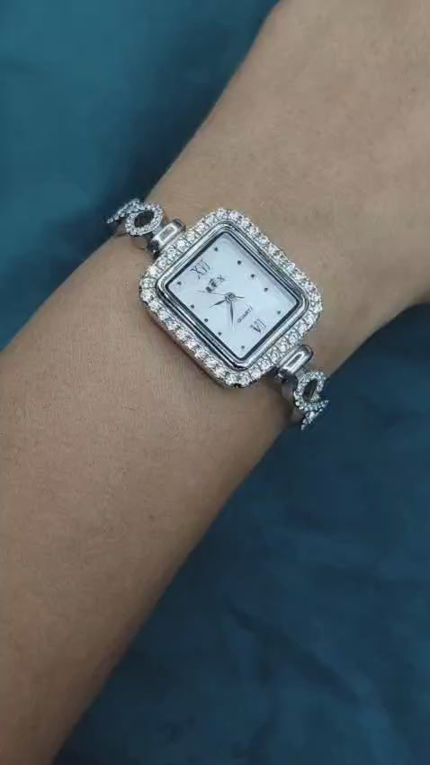 Made in excellent 92.5 sterling silver, this beautiful watch boasts a rectangular face completely bordered with brilliant-cut cubic zircon stones for ultimate shine. The dainty chain bracelet is secured by adorable cz-embellished infinity charms, representing limitless style and glamour. With its slender, adjustable chain and secure closure, this item provides an easy fit and a sophisticated, luxurious appearance.