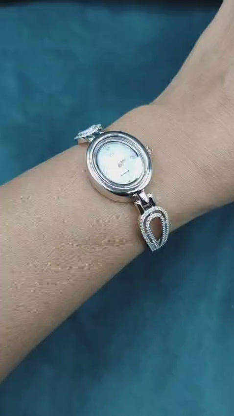 This stunning timepiece beautifully blends infinite elegance with a wearability factor, all with a pure 92.5 sterling silver being used in this timepiece. Additionally, this timepiece contains a small oval face featuring a luminous dial with a lovely ladies’ band detail in an open ‘heart’ design accented with cubic zircon brilliants,