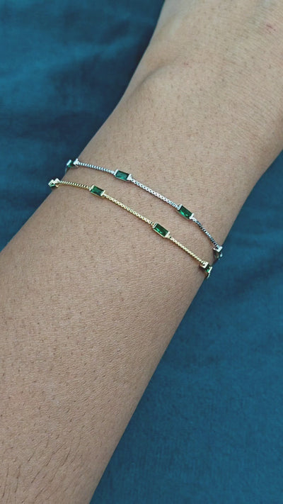 This beautiful piece of jewelry is made of high-quality 92.5 sterling silver pure silver and is available in silver and gold plating. It is designed with a simple yet elegant chain that is adorned with baguette-cut emerald green stones. It is perfect for those who want to add some color to their outfit while looking elegant and sophisticated. It is designed with an adjustable 8.3-inch chain and a spring ring closure that provides a loose fit on the wrist.