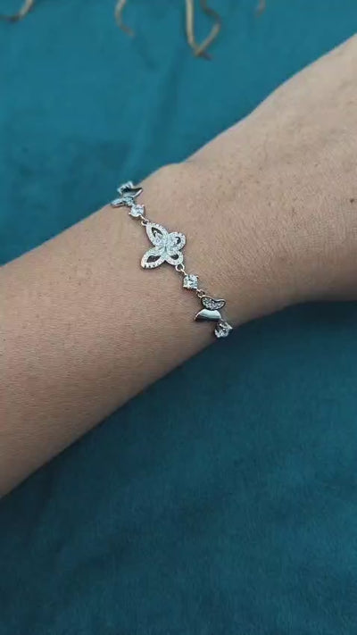 This elegant 92.5 sterling silver bangle is adorned with a playful butterfly design, pavé-set with sparkling cubic zircon stones to give it a dazzling diamond effect. The slender box chain is dotted with interlocking silver butterflies and sparkling solitaire stones to give it a dynamic look that seems to move with every gesture. This bangle comes with a secure adjustable slider clasp and is perfect for those who want a customized fit for their accessory.