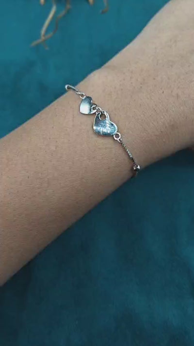 This beautiful 92.5 sterling silver box chain bracelet comes with a light interlocking double heart design, representing an endless connection. The polished silver beads are placed evenly on the chain, giving it a rhythmic touch. The design of this bracelet is perfect, with a spring ring closure and loose-fitting design, making it a great accessory for everyday wear or as a gift.