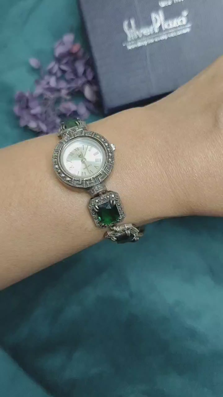 Unveil timeless elegance with our 92.5 Sterling Silver Marcasite with Stone Women's Watch. This intricately designed timepiece blends vintage charm with modern craftsmanship, featuring sparkling marcasite stones and a central gemstone that elevates your style to new heights. Perfect for women who appreciate unique, sophisticated accessories with a hint of classic allure.