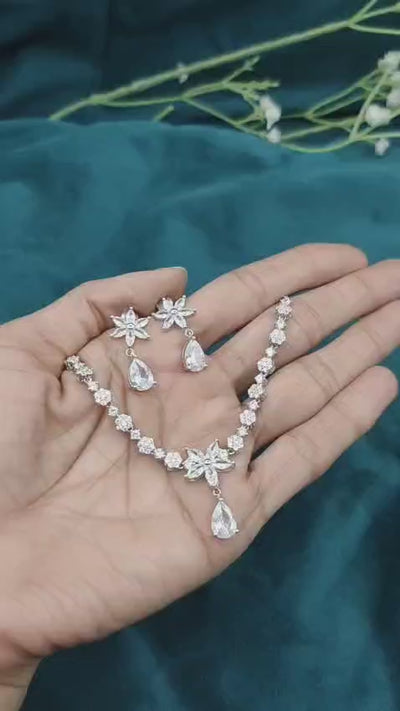 This exquisite necklace collection has been made from quality 92.5 sterling silver. It consists of a chain of bright-cut stones leading up to a marquise, pear-shaped cubic zircon centerpiece. The piece resembles the flicker of diamonds. It consists of cascading teardrops, which provide a stunning movement effect. This collection comes complete with a pair of drop earrings featuring a design of a centerpiece floral motif. It adds a stunning look to a wedding party.