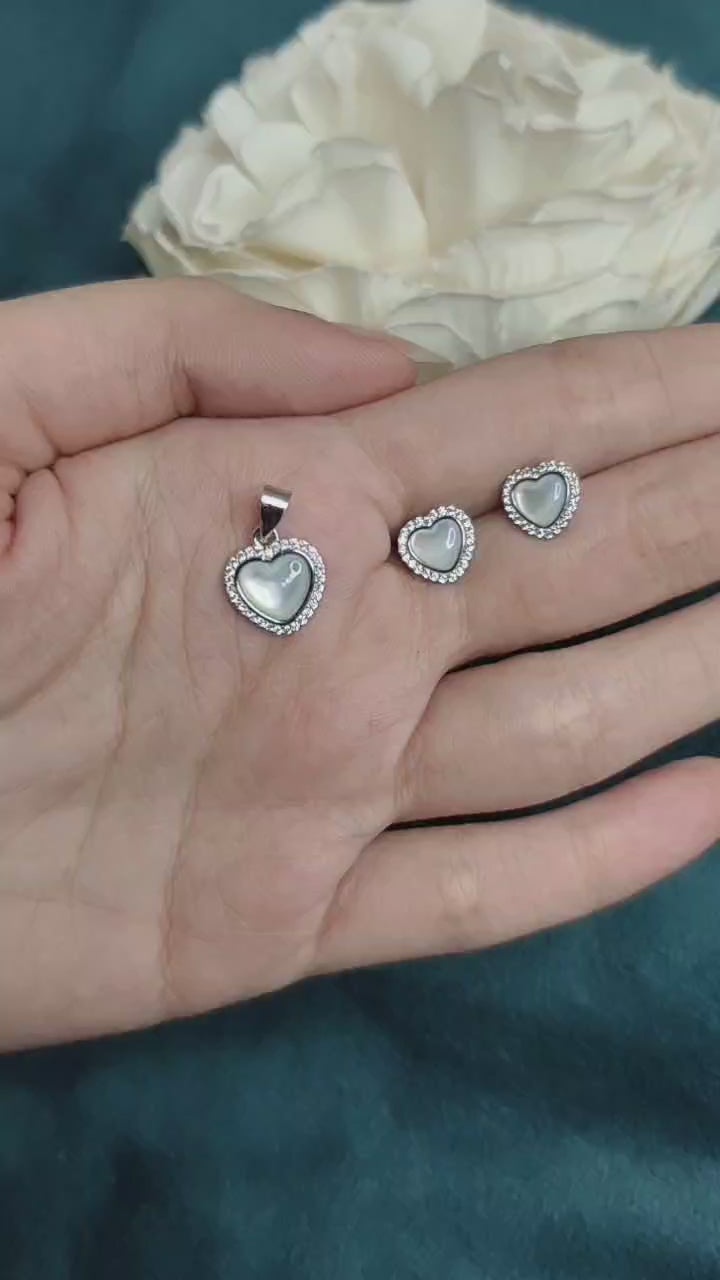 Embrace elegance with this 92.5 sterling silver mother of pearl heart shape pendant set. Featuring a radiant heart-shaped mother of pearl, set in gleaming sterling silver, this set exudes timeless charm. A perfect blend of sophistication and grace, ideal for both everyday wear and special moments.