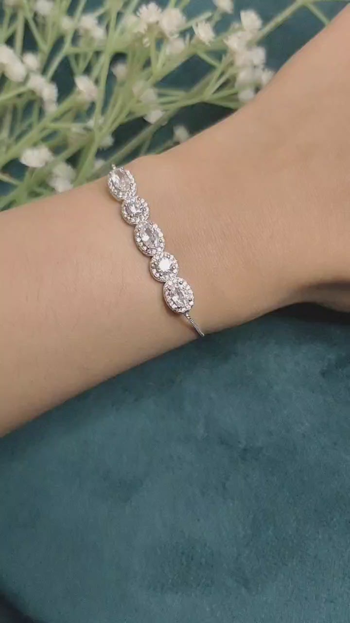 This elegant and modern bracelet features a unique oval-shaped cubic zirconia tennis design. Crafted from 92.5 sterling silver, it offers a timeless and sophisticated look. The loose style allows for easy adjustment, ensuring a comfortable fit on any wrist.