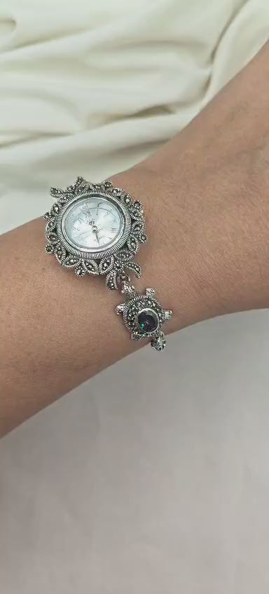 This exclusive 92.5 sterling silver timepiece boasts a quirky design with a turtle theme, where each turtle shell bears a beautiful amethyst stone surrounded by sparkling marcasite stones. The main face is surrounded by a beautiful, intricate oxidized design with a floral theme, reminiscent of a classic vintage look with a quirky twist. This beautiful piece is designed for maximum comfort and wearability, with a slider bolo chain that can be adjusted to fit any wrist size.