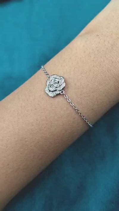 Expertly crafted from 92.5 sterling silver pure silver, this beautiful and elegant piece of jewelry features a lovely rose design centerpiece with zircon stones. The floral design of the piece is complemented by a chain and lobster clasp, ensuring that it can be worn with ease. The adjustable length of the chain allows for a loose fit, ensuring that it can be elegantly draped across the wrist.
