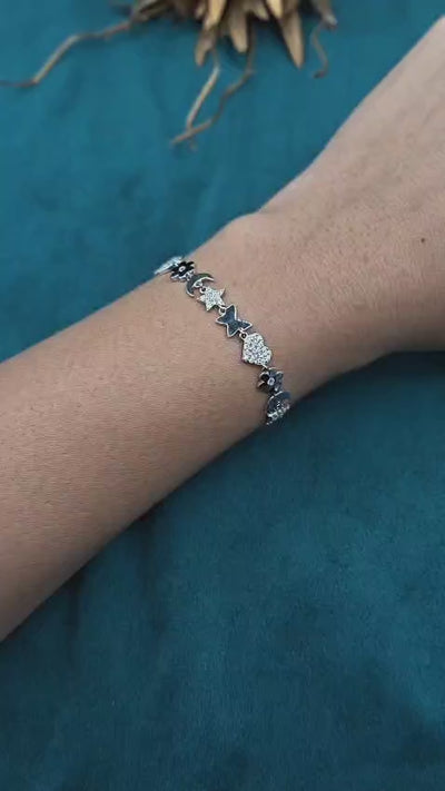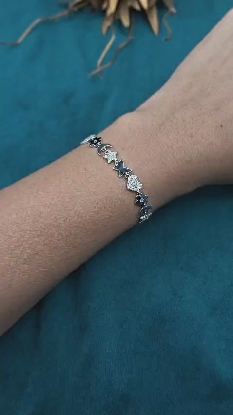 This magical 92.5 sterling silver bracelet is adorned with a celestial pattern, featuring a sparkling array of cubic zircon charms in the form of hearts, stars, moons, and flowers. Every intricately designed chain is studded with sparkling stones that shine from all sides, giving this piece a radiant and mystical look. Completed with a strong lobster clasp and extender chain, this piece is perfect for a loose fit that can be customized as per your preference, making it a great accessory to add a dash of magic to your wardrobe.