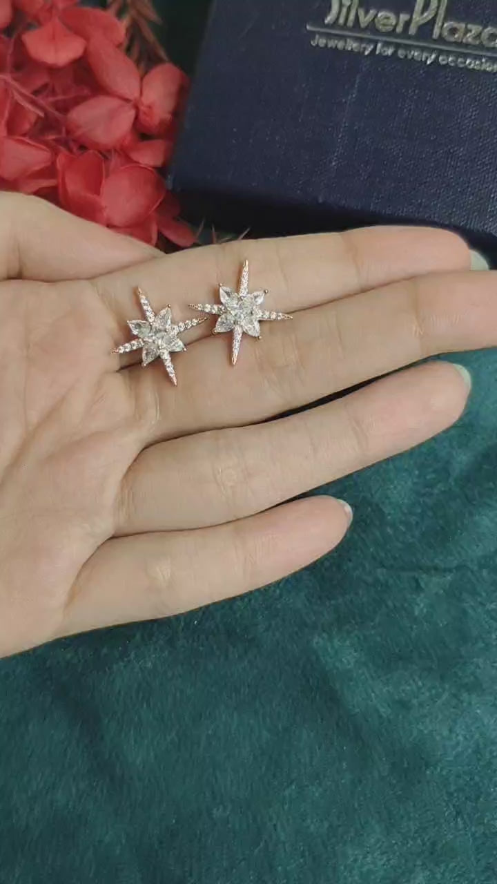 Embrace celestial elegance with these exquisite 92.5 sterling silver star rose plated cubic zircon stud earrings. Crafted from pure sterling silver and plated with a stunning rose gold finish, these earrings are both stylish and durable, making them the perfect accessory for any occasion. The captivating star design, adorned with sparkling cubic zirconia stones, adds a touch of glamour and cosmic charm. The delicate stud style makes these earrings versatile and easy to wear.
