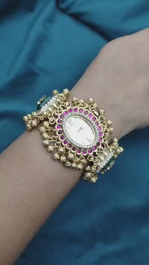 This beautiful timepiece is a masterwork, blending antique glamour with intricate detailing. It boasts a superior antique gold coating that finely accentuates a range of imitation precious-look stones. The tiny dial is bordered by glinting cubic zircon and pink-colored stones, while the complex, chain-type bracelet has emerald-green imitation gemstones. The whole design has light ghungroo (small bead) details that provide lovely texture and movement. Fitted with an adjustable clasp,