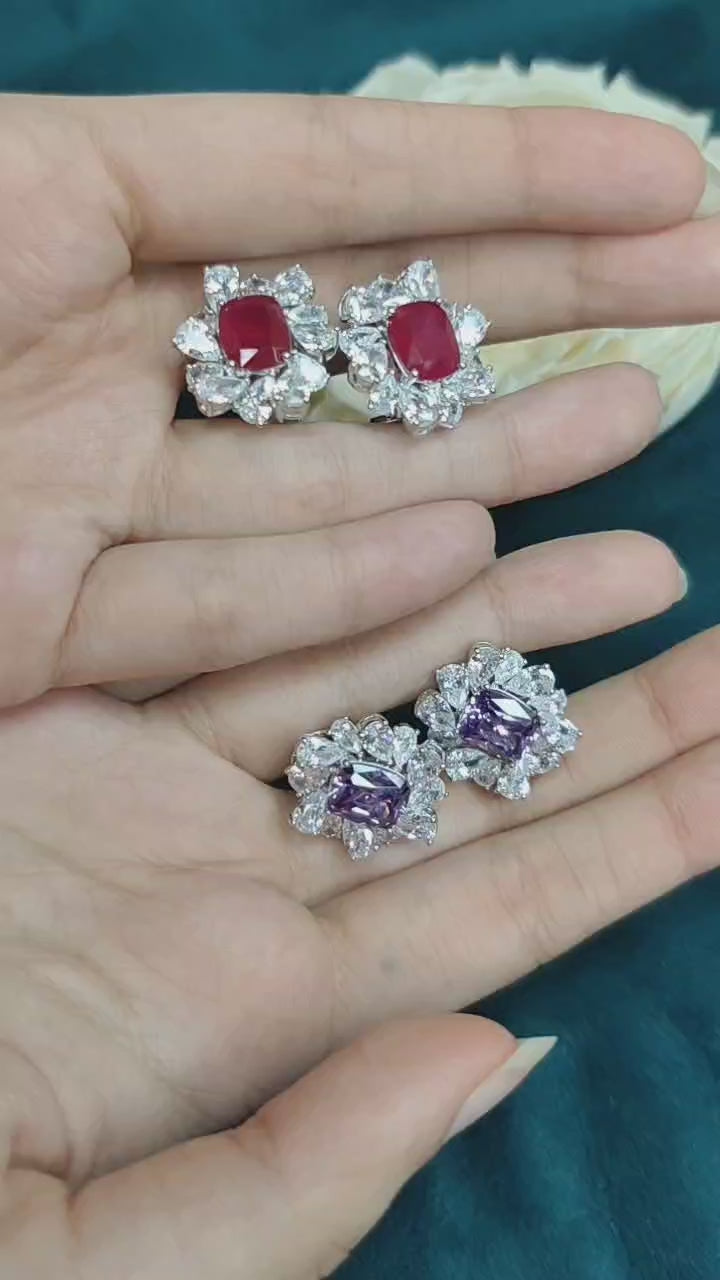 These beautiful stud earrings feature a large round cubic zircon stone at the center, complemented by small drop-shaped stones on the side. In stunning red and purple hues, they offer a striking contrast that adds a touch of elegance and color to any look.