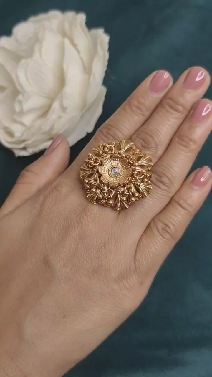 Bold and vintage-inspired, this big antique flower shape adjustable ring showcases intricate floral detailing with an antique finish. Designed to make a statement, its adjustable fit ensures comfort while adding a touch of timeless elegance to traditional or fusion outfits.