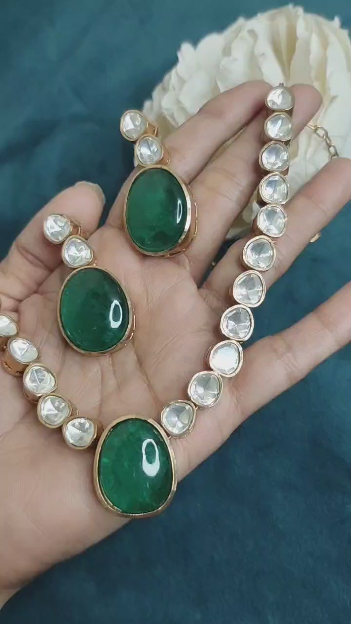 Big Emerald Stone Kundan Short Necklace Set