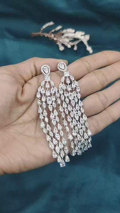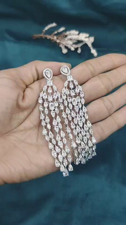 Exuding eternal glamour, these long chandelier earrings are masterfully silver-plated and bedecked with premium cubic zircon and marquise-cut stones. The delicate teardrop stud design flows into five shimmering strands of alternating marquise and pear-shaped gems, creating a stunning waterfall effect. Perfectly weighted for comfort and a high-voltage sparkle, these statement earrings are the finishing touch for any reception, gala attendee, or formal evening celebration.
