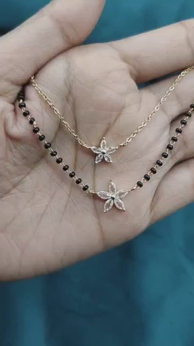 This is an exquisite, two-tier gold-plated Mangalsutra with a delicate and fashionable twist on the traditional married jewelry. Accented with customary black beads on the chain, it is supported by two charming floral pendants wherein the petals are brilliantly set with marquise cut diamond stones. Subtly glittering and extremely lightweight, this is a very modern piece that you can wear every day to add a little touch of sophisticated sparkle.