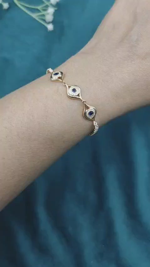 Embrace the effortless charm of this stunning gold-plated bracelet, adorned with a subtle string of sparkling cubic zircon stones that lead to three prominent centerpiece motifs in the shape of eyes. Each of these motifs is carefully inlaid with a deep blue kemp stone, surrounded by a halo of bright accents that give this piece a look that is at once traditional and luxurious. The bracelet is designed to be infinitely versatile, featuring a bolo-style adjustable closure with gold-bead ends.