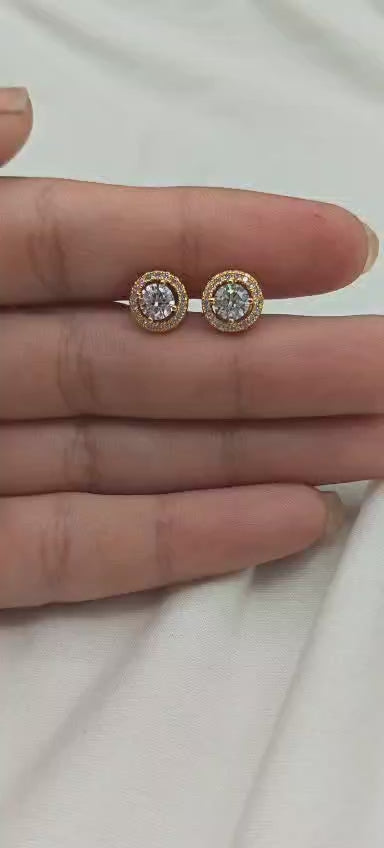 These stunning gold-plated stud earrings have a traditional circular design, carefully crafted to ensure a sense of sophistication within your jewelry collection. Each of these earrings boasts a stunning cubic zircon gemstone, surrounded by a halo of smaller faceted gemstones that sparkle and shine with every rotation. These earrings have been carefully designed to ensure a secure fit, providing a chic and sophisticated look that can be easily transitioned from a busy workday to a night out.