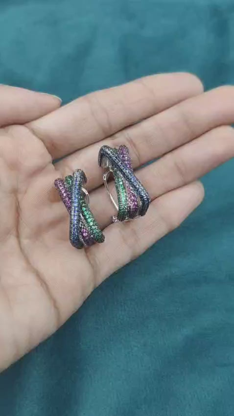 These high-end earrings with a clear black polished metal finish. The broad, structured design is smothered in radiant, multi-colored cubic zircon stones placed in an intriguing criss-cross pattern. The ideal accessory for individuals who adore high-drama color and carefree style.