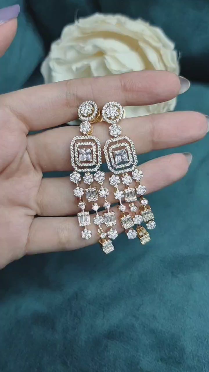 Elegant and eye-catching, these cubic zircon baguette stone women's big earrings are designed to make a statement. Featuring a stunning combination of gold and silver polish, these earrings exude luxury and versatility. The meticulously placed baguette-cut cubic zircon stones create a dazzling sparkle, perfect for any occasion.