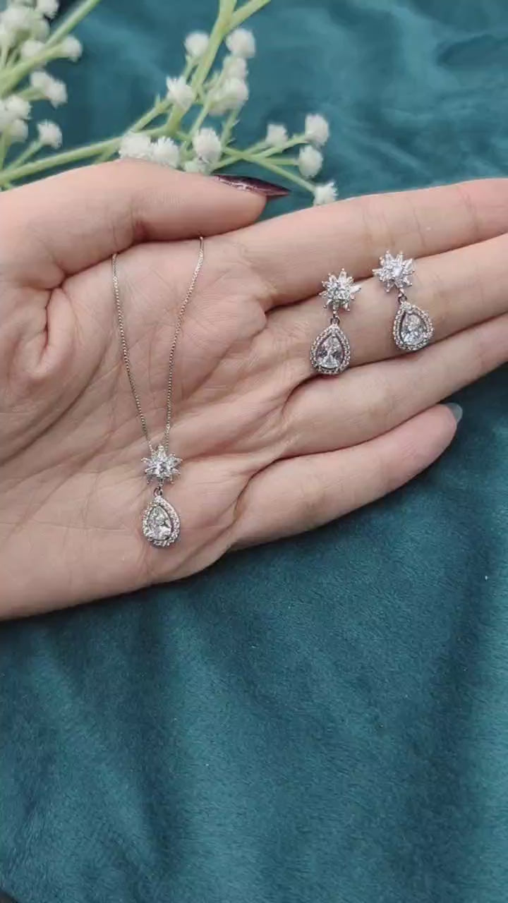 Cubic Zircon Crystal Bloom Drop Shape Delicate Pendant Set