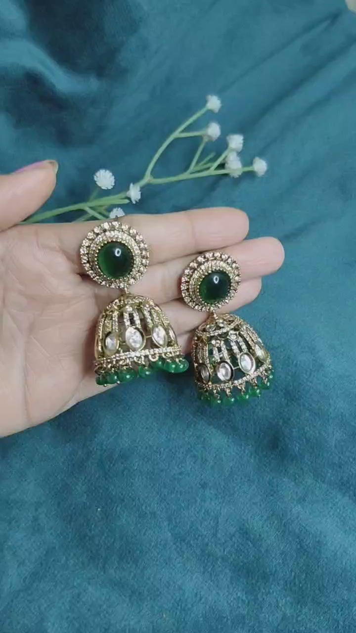 Cubic Zircon Ethnic Style Antique Gold Green Big Kundan Jhumka Earring