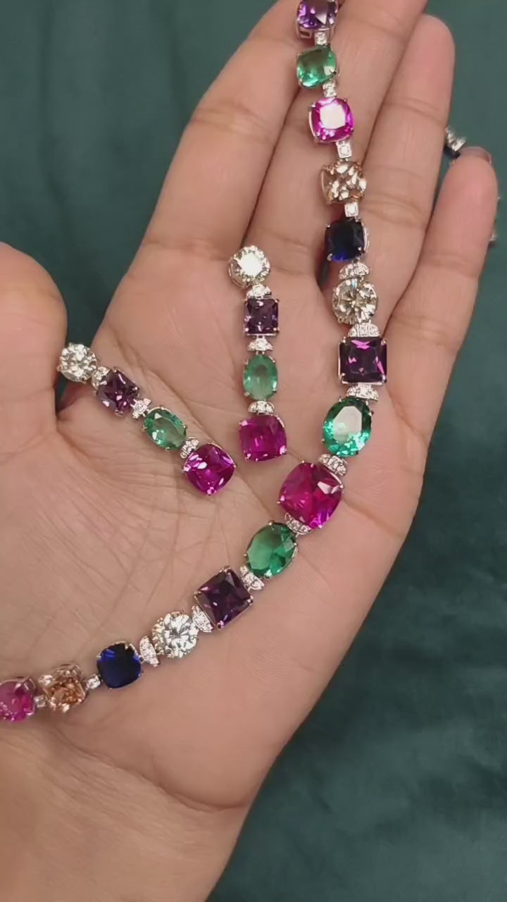 Floral design rhodium multi-color necklace set a bright and striking piece, this multi-color flower design rhodium-plated necklace set is ideal for introducing a touch of elegance and color to an outfit. The set boasts a beautiful floral design, embellished with shining cubic zircon stones in multiple colors. The rhodium plating gives a hardwearing, tarnish-resistant finish, guaranteed to protect the jewelry's long-term beauty.