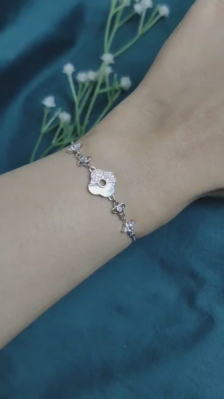 A refined bracelet that blends modern design with timeless elegance. A radiant piece that captures floral beauty with shimmering cubic zirconia and pearlescent textures. The alternating floral charms and central bloom create a delicate, statement-worthy design.