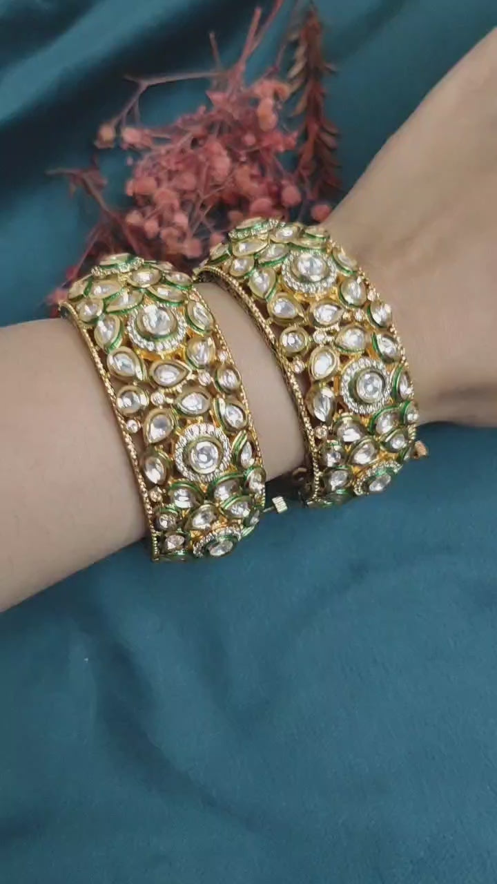 Cubic Zircon Gold-Plated Drop Shape Stone Green Kundan Bangles are exquisite pieces of jewelry that combine traditional Indian craftsmanship with modern materials and a touch of unique design. Here's a breakdown of what this description entails: Cubic Zircon: These are synthetic diamonds that mimic the brilliance and sparkle of real diamonds. They are often used as a more affordable alternative to real diamonds. Gold-Plated: The base metal of the bangles is likely not pure gold, but rather a less expensive metal like copper or brass that has been coated with a thin layer of gold for a luxurious look and feel.
