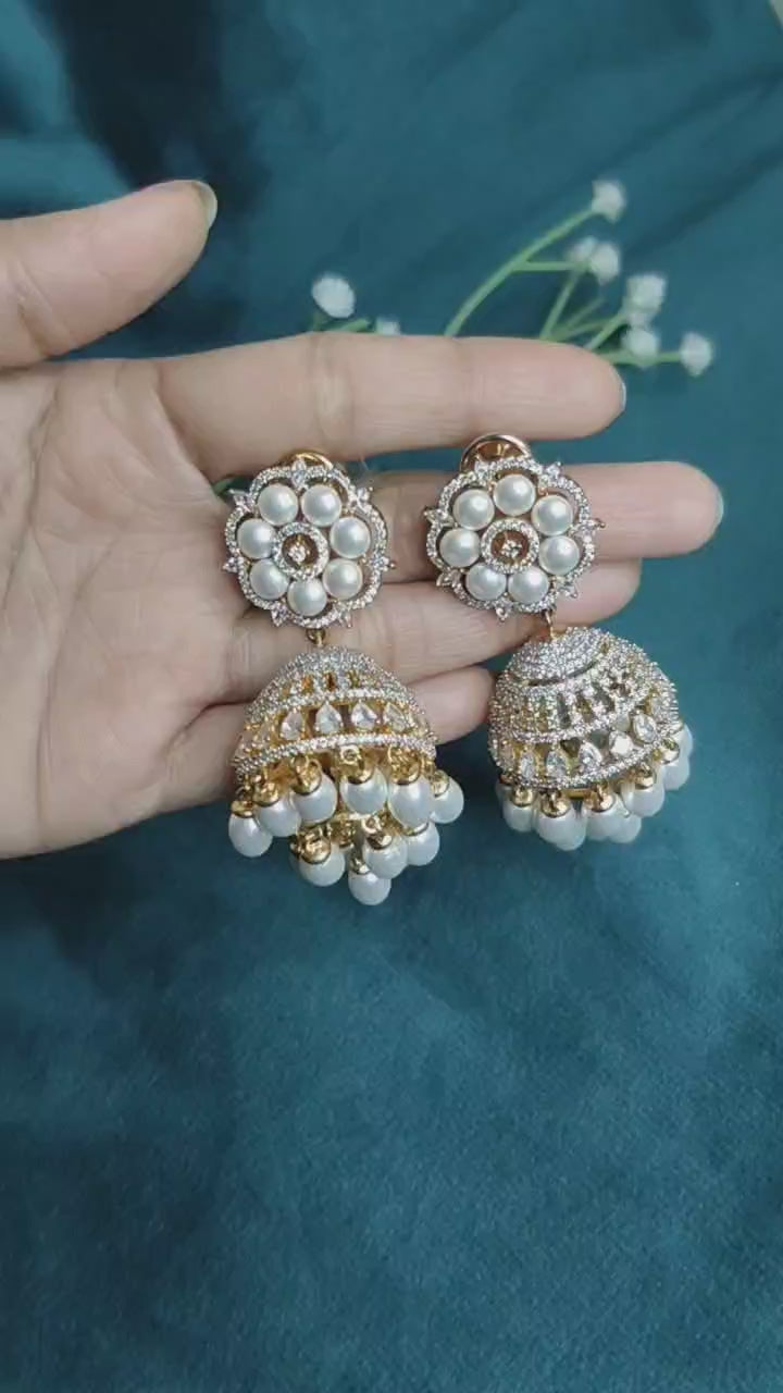 Cubic Zircon Gold Plated Floral Pearl Big Jhumka Earrings