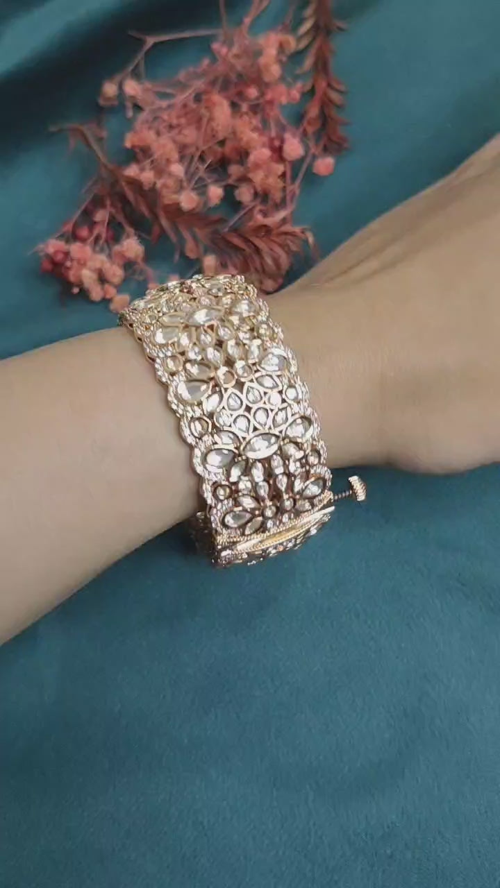 Cubic Zircon Gold-Plated Kundan Openable Broad Bangle (Single)