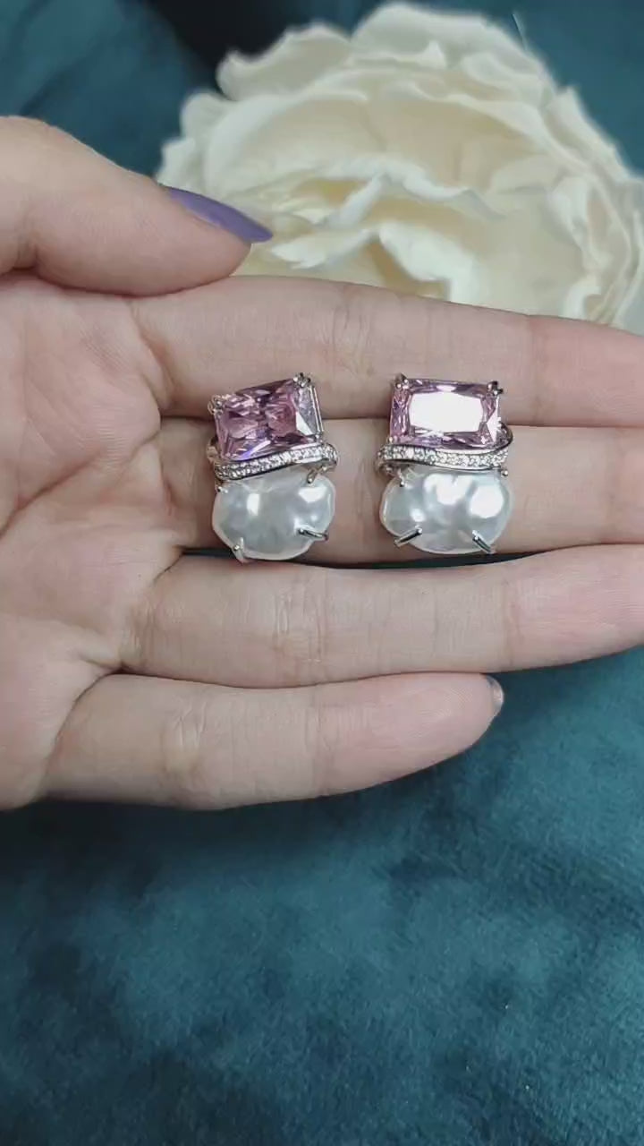 Cubic Zircon Light Pink Stone Pearl Earring