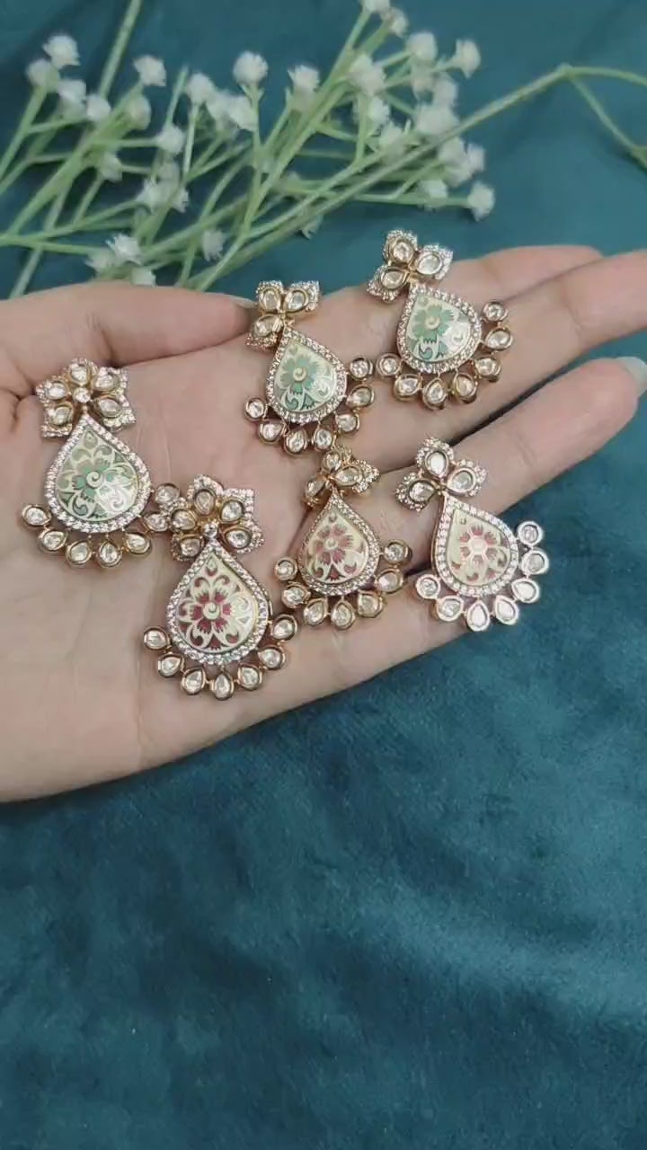 Cubic zircon meenakari kundan pendant set features a classic design that seamlessly combines the intricate detailing of meenakari with the opulent brilliance of kundan stones. It typically showcases a central motif surrounded by ornamental patterns, which may include floral, paisley, or geometric designs.