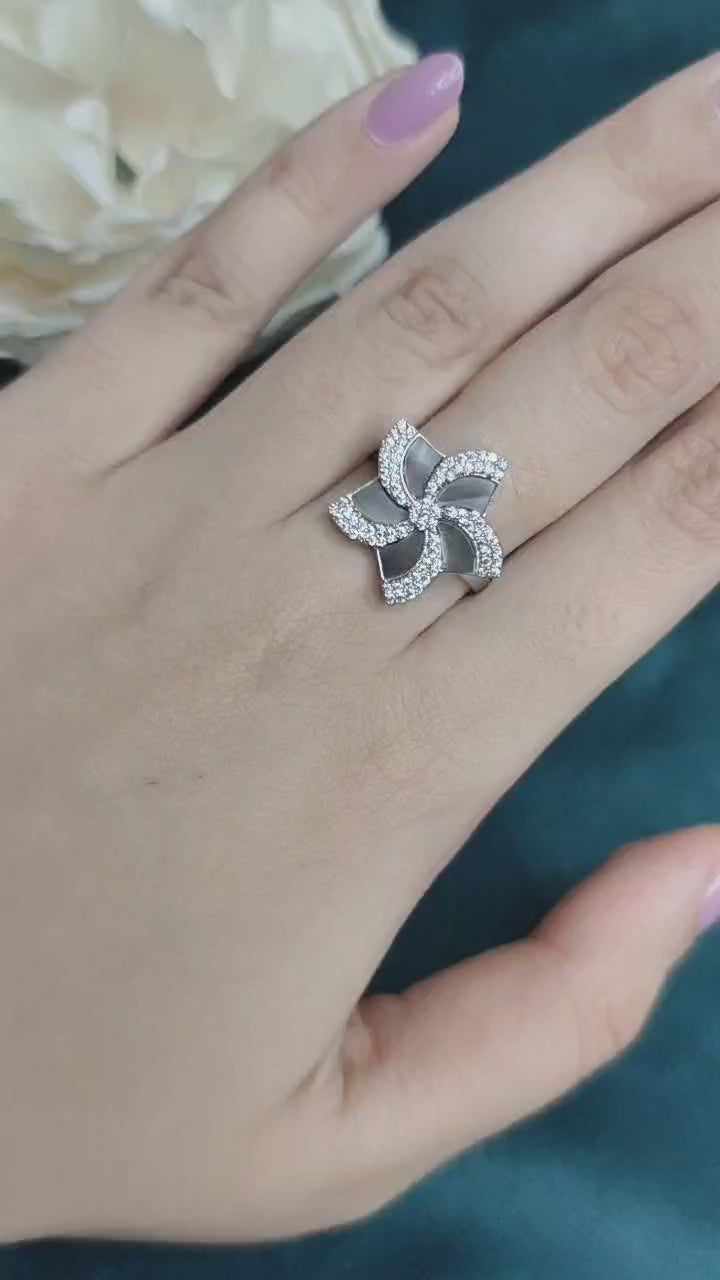 This stunning adjustable finger ring features a charming star flower design, elegantly crafted with shimmering Cubic Zirconia stones and iridescent Mother of Pearl inlays. It offers a comfortable, flexible fit perfect for any woman.