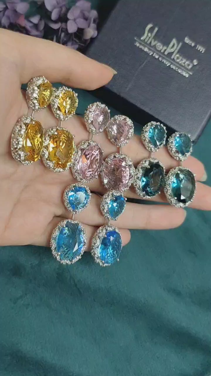 Add a touch of charm with these delicate oval-shaped earrings. Featuring small oval cubic zircon stones in soft shades like light blue, yellow, teal blue, and light pink, each is topped with a sparkling diamond-like stone for added elegance. The bottom showcases larger oval stones in complementary colors, creating a stunning contrast. Perfect for casual outings or special events, these earrings bring a graceful pop of color to your style.
