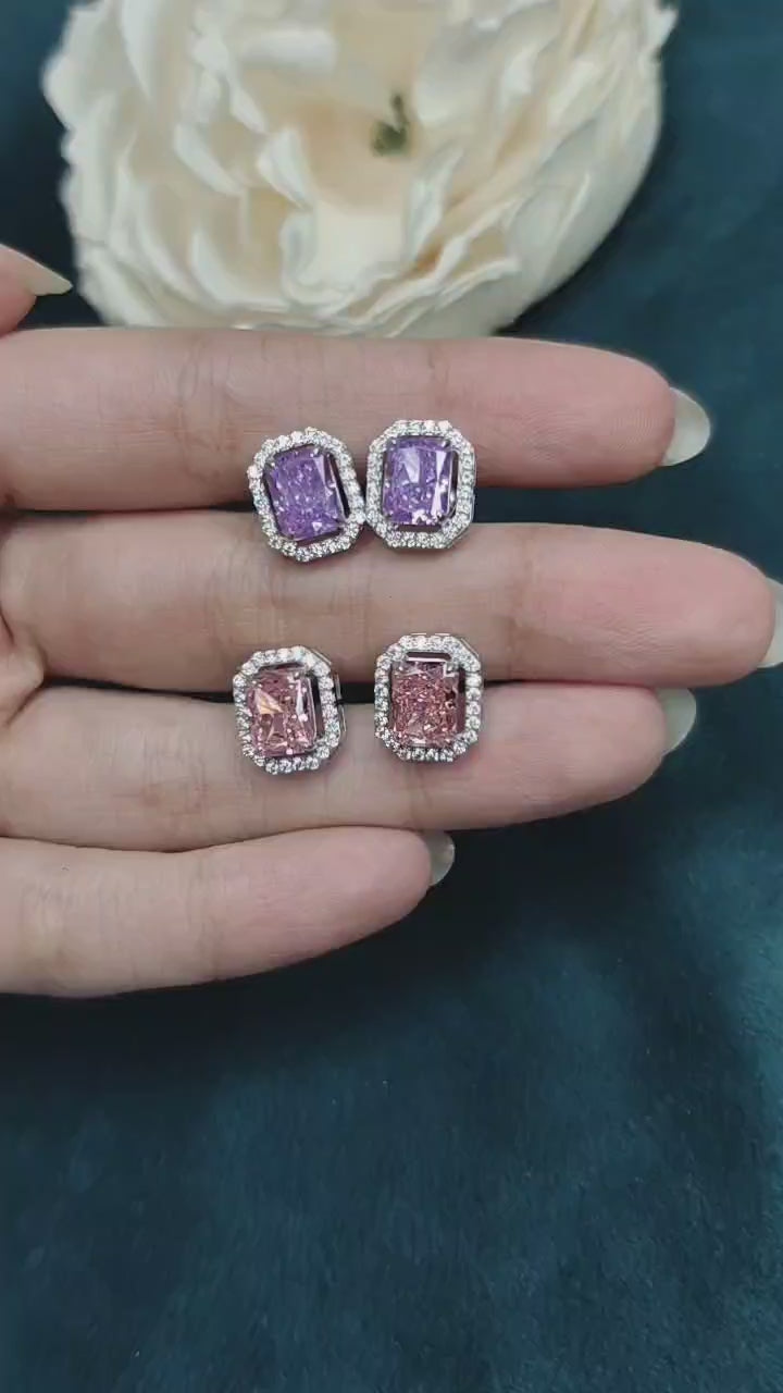 These delicate small square-shaped stud earrings feature a central light pink cubic zircon stone, surrounded by sparkling light purple cubic zircon stones on each side. The soft pastel hues and elegant design create a refined and sophisticated look, perfect for adding a subtle touch of color and shine to any outfit. Ideal for both casual and special occasions, these earrings bring a graceful, feminine touch to your style.