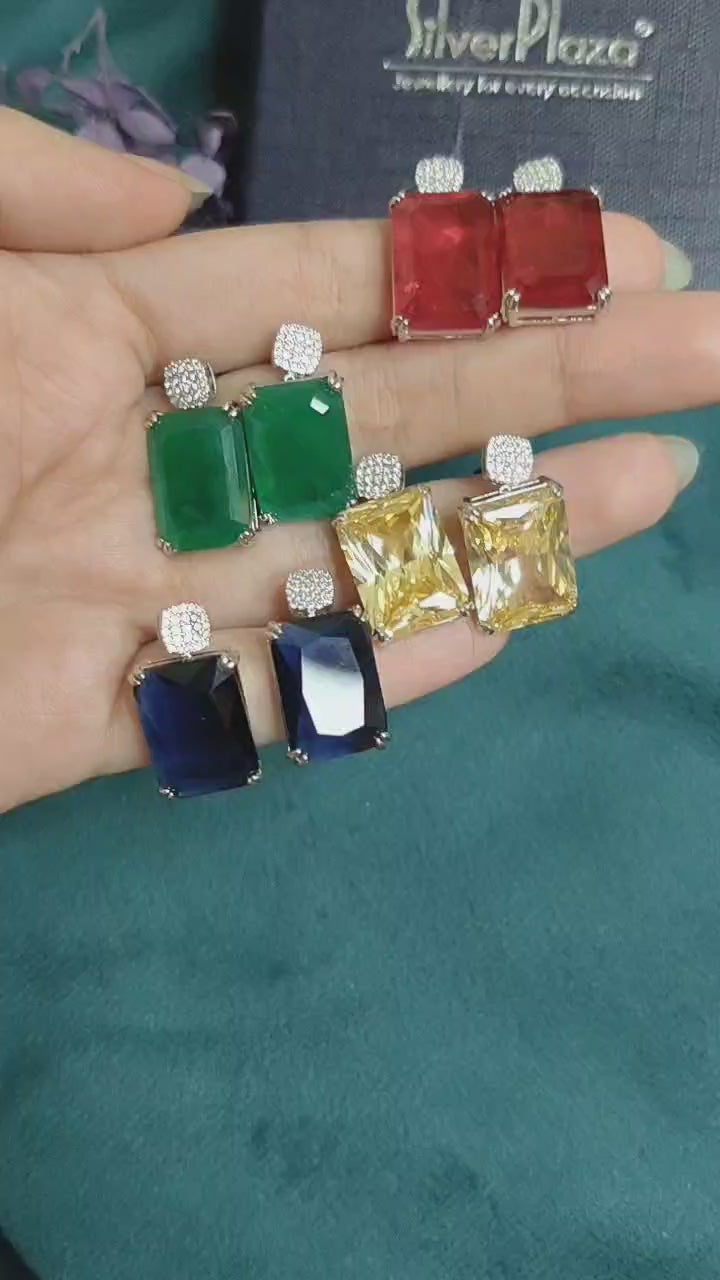 Brighten up your look with these vibrant stud earrings! Featuring a small square cubic zircon with a sparkling diamond-like stone on top, these earrings are paired with a larger square-shaped stone in bold colors like blue, yellow, green, and red at the bottom. Perfectly designed to add a pop of color and elegance to your outfit, these earrings are ideal for both casual and festive occasions.