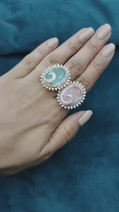 Cubic Zircon Studded Pastel Oval Shape Adjustable Big Finger Ring For Women