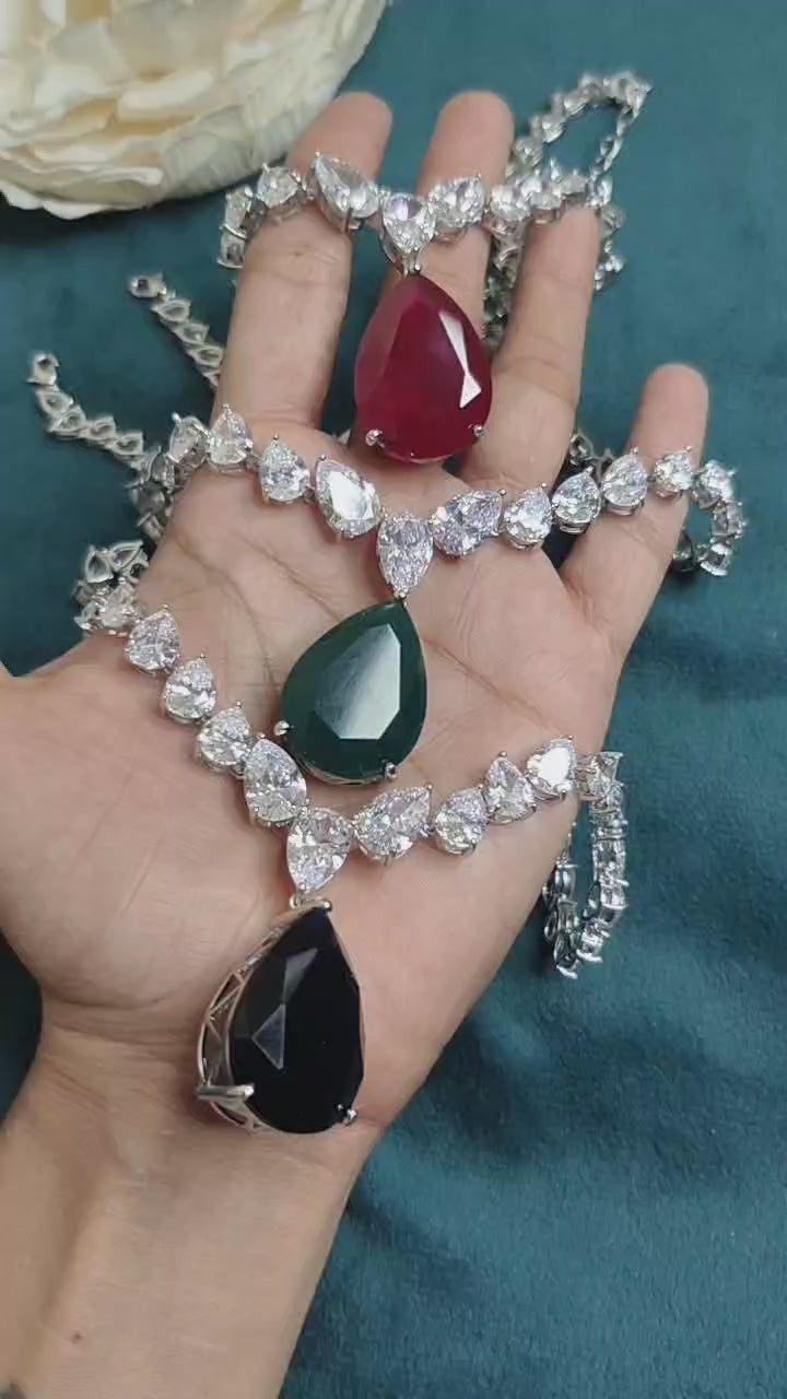 Elevate your sophistication with this beautiful cubic zircon tear drop designer necklace set. meticulously crafted, this collection comprises luminous tear-drop-shaped cubic zircon stones beautifully aligned in a refined design, radiating classic beauty. The fine polish improves its brilliance, presenting it as an ideal choice for evening events, weddings, and evening parties.