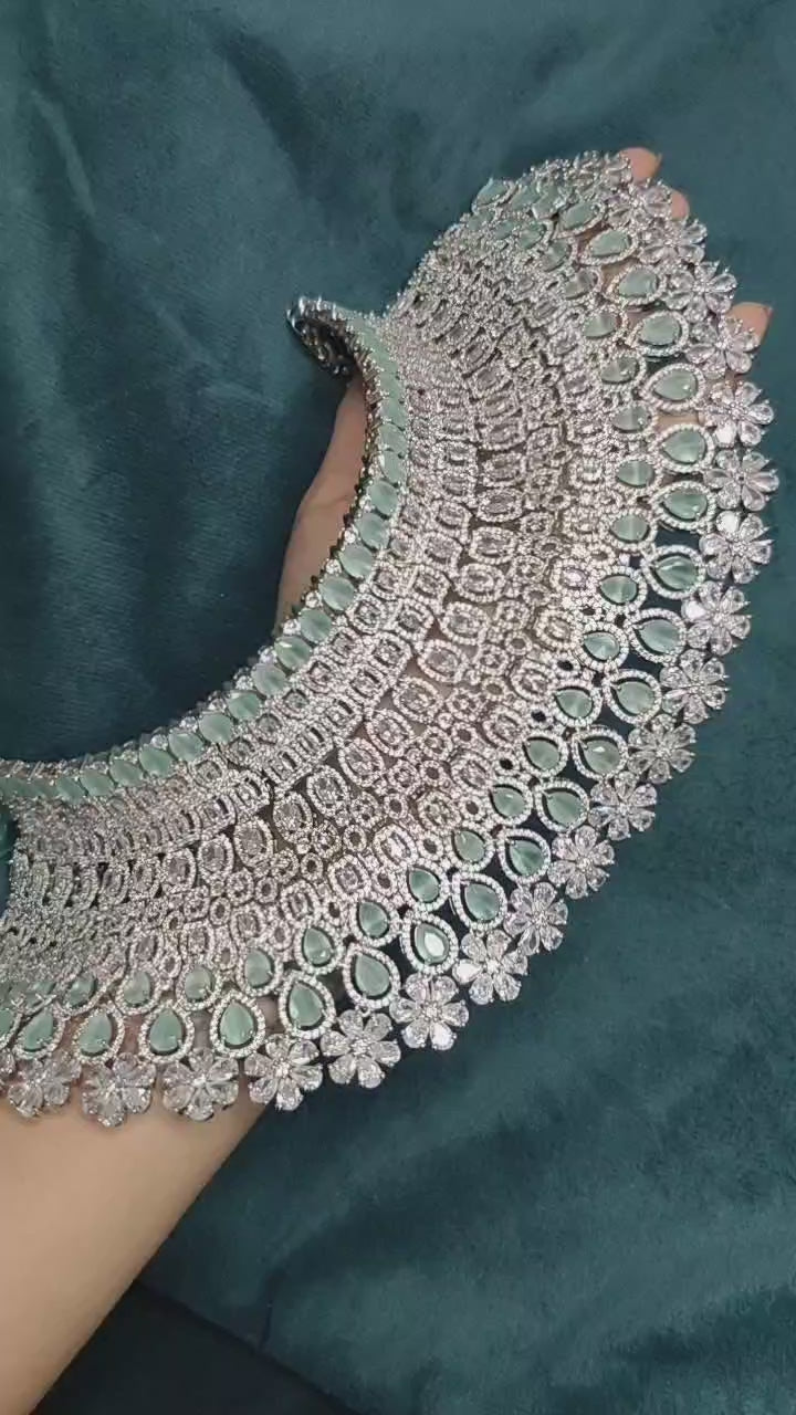 A CZ Gold-Silver Plated Heavy Wedding Bridal Necklace Set is a stunning and opulent piece of jewelry designed for brides on their special day. It combines the elegance of emeralds, the sparkle of cubic zirconia (CZ), and the intricate craftsmanship of traditional Indian jewelry.