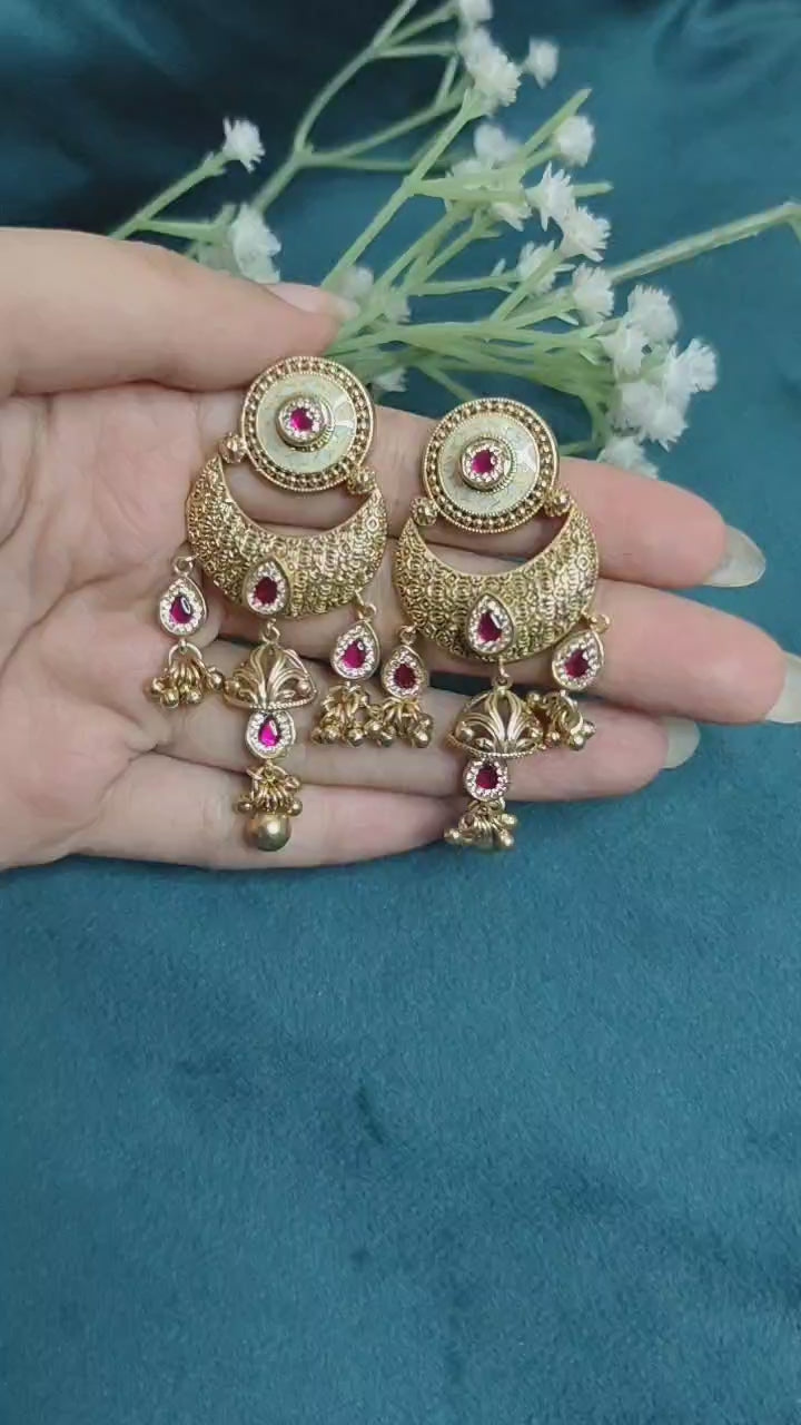 Kundan antique chand bali gold-plated traditional women earring this is a beautiful and elegant pair of earrings that blend traditional indian craftsmanship with modern materials. Here's a breakdown of the key features cubic zirconia these synthetic gemstones are used to mimic diamonds, offering a brilliant sparkle at a more affordable price. kundan this traditional indian technique involves setting precious or semi-precious stones in gold foil. In this case, stones are likely set in gold-plated foil.
