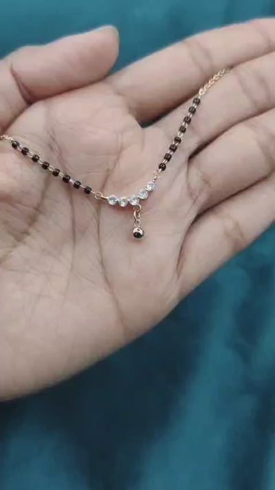 This exquisite gold-plated mangalsutra is a delicate combination of heritage with a dash of contemporary design, featuring the sacred black beaded chain. A soft yet striking pendant with brilliant cubic zircons set in a flowing curve and finished with a classic golden bead drop anchors it. It is a perfect everyday accessory with just the right amount of sparkle to beautifully symbolize tradition for the modern woman.