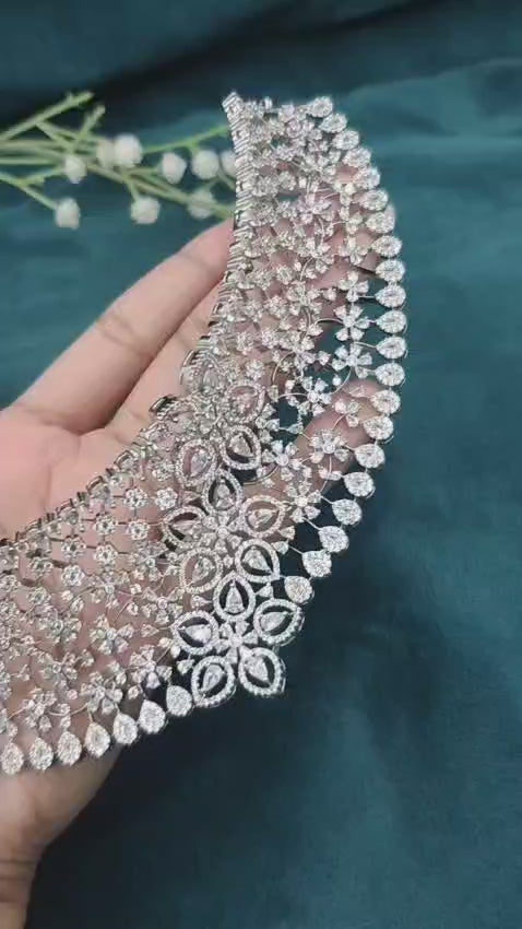 Delicate Floral Lace Cubic Zircon Silver Plated Choker Set With Maang Tikka