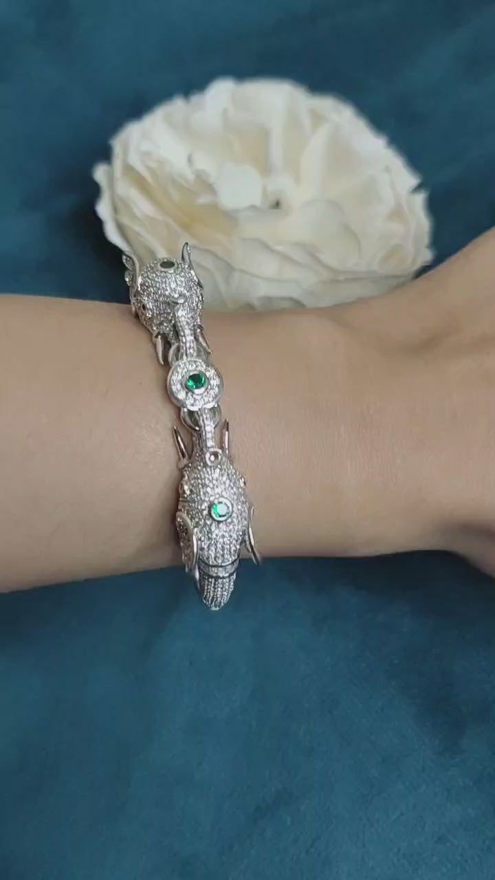 The double elephant head cubic zircon kada bracelet is an exquisite blend of tradition and luxury. Each elephant head is detailed with sparkling cubic zirconia, while the striking green stones on the eyes and head add a vibrant contrast. This unique bracelet embodies strength and elegance, making it a perfect accessory for special occasions.