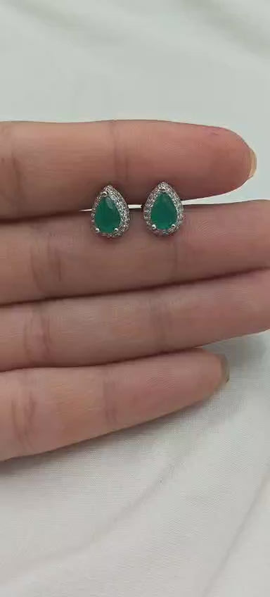 Drop Shape Emerald And Cubic Zircon Silver Plated Small Stud Earrings