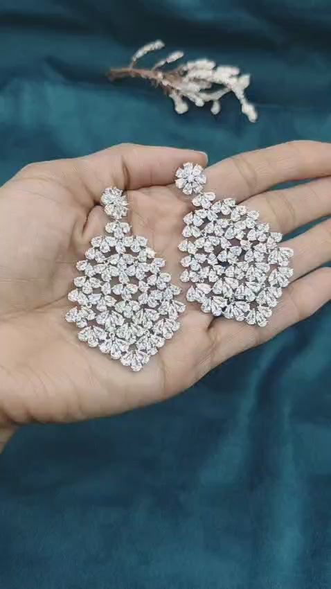 Complete your evening look with these exquisite pair of silver plated long earrings, boasting an elegant chandelier design that exudes timeless sophistication. Both earrings are finely pavé-set with sparkling diamond-cut crystals in a classy floral and pear-drop design intended to capture and reflect light from all angles. These lightweight and impactful earrings boast a luxurious and high fashion finish complete with diamonds designed for weddings, receptions, and other special occasions.