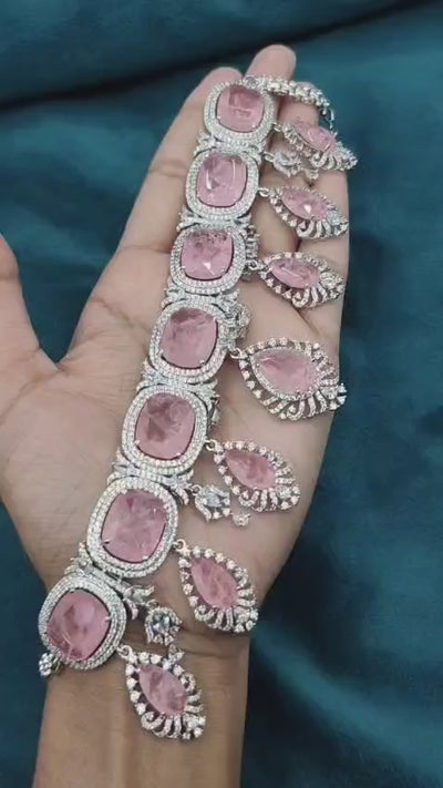 Elegant Teardrop Pestle Pink Cubic Zircon Silver Plated Choker Necklace Set