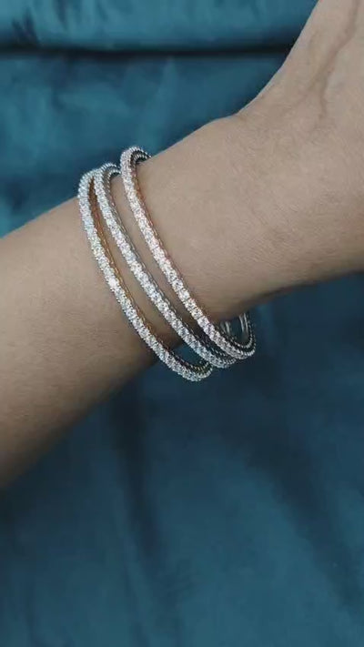 Add that necessary spark to your collection with these gorgeous cubic zircon tennis style fixed bangles that are crafted to resemble the brilliance of real diamonds. Perfect to layer or wear in solo triumph, these elegant pieces are offered in three sumptuous finishes-classic gold, romantic rose gold, and timeless silver plating. Constructed with durability and sparkle, these bangles provide a snug fit and are sure to be the perfect accessory for festive celebrations, formal wear, or elevating your daily look.